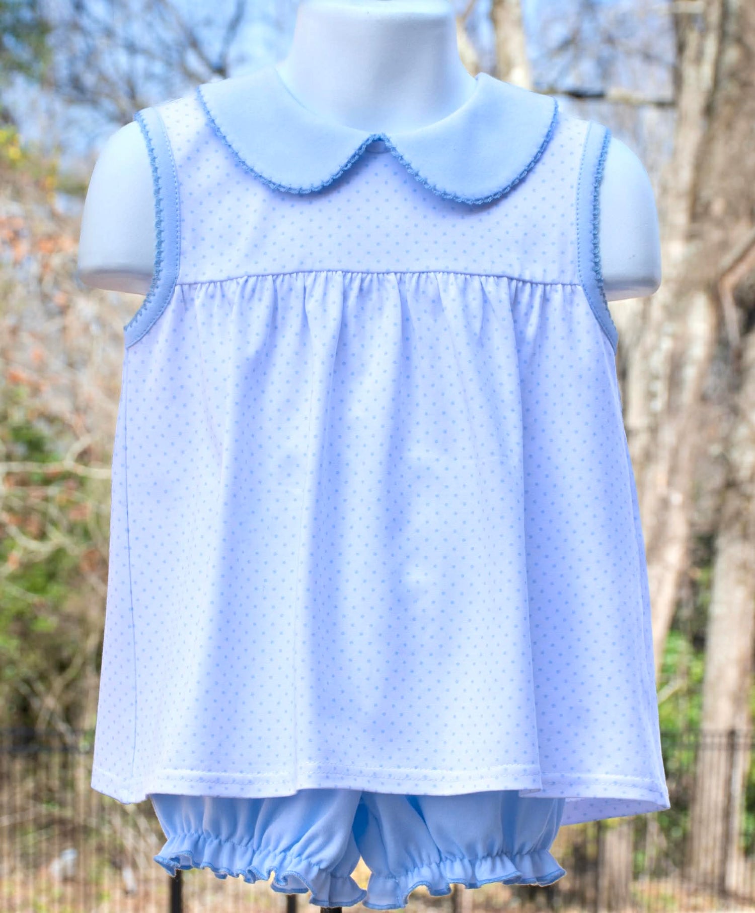Sleeveless Blue Bitty Dot diaper top with solid blue collar and biased arm. Blue picot trim around collar and armholes, bottoms or crochet sold separately.