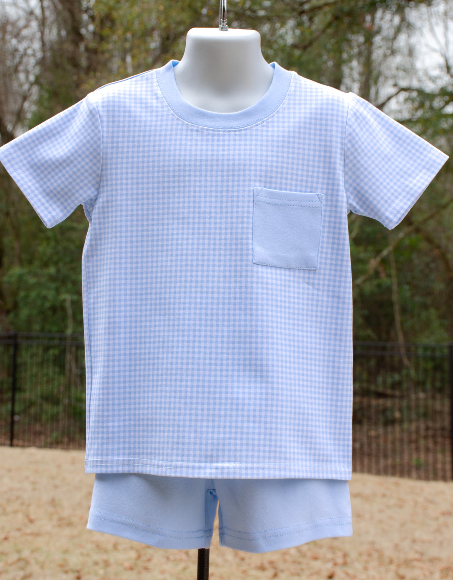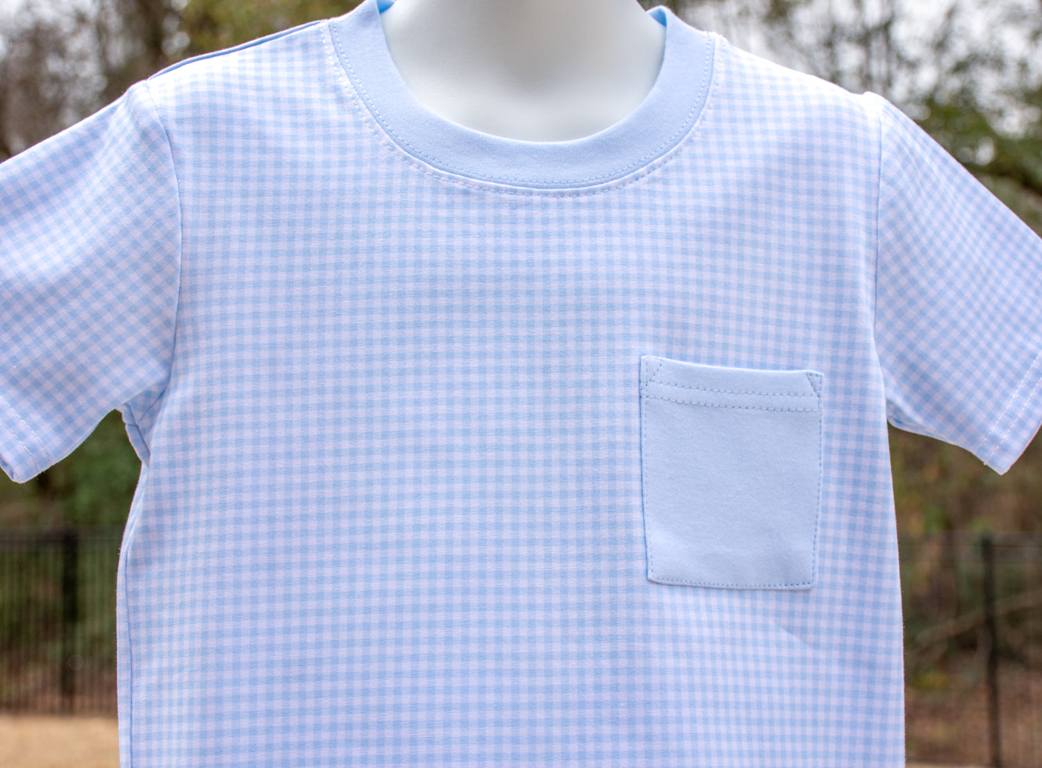 Short sleeve boys T-shirt in Blue check print with solid blue neck bias and chest pocket, bottoms sold separately!